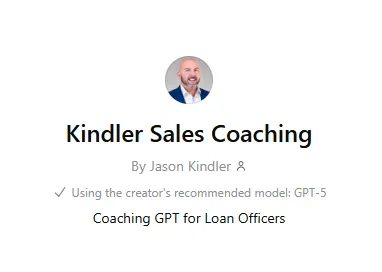 The Kindler Sales Coaching GPT is built from Jason’s top 1% loan officer experience, real coaching transcripts, and proven strategies that actually move the needle. This isn’t generic AI- it’s the same scripts, strategies, and mindset coaching Jason uses with his team every week. Click the link below to try it out and check out the video attached to hear directly from Jason!